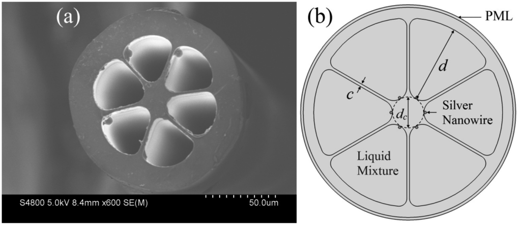 Six-hole PCFs, also termed grapefruit fibers, are shown in Figure 1a []. For sensor operation, each of the holes is filled with one silver nanowire of 300 nm diameter and a large thermo-optic coefficient liquid. The liquid with silver nanowires can be full-filled into the air holes by capillary force and air pressure. The fabrication should be easy because the air holes of the PCF are large enough. Then, the two ends of the liquid-filled PCF are spliced to standard single-mode fibers (SMF) using a commercial fusion splicer [,]. The cross section of the resulting structure is schematically depicted in Figure 1b. When the phase matching is satisfied at a certain wavelength regime, the energy of a core mode is transferred to a plasmonic mode. As the plasmonic mode is highly lossy, a significant increase in loss will be observed at this wavelength regime.