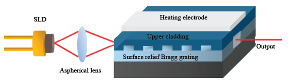 Figure 1 shows a schematic of an integrated wavelength-swept TO laser chip. The integrated laser consists of a superluminescent laser diode (SLD), a heating electrode on the top surface of the upper cladding, an aspherical lens, and a polymeric waveguide Bragg reflector with TO tuning capability. The details of the laser fabrication process were described in a previous paper [16]. The dimensions of laser chip are 36 × 18 × 10 mm3, which is quite compact. The laser chip was fabricated with a tight hermetic seal to ensure its insensitivity to air humidity. The use of the laser chip provides many advantages in terms of cost-effectiveness and compactness to build various application systems utilizing a wavelength-swept TO laser chip.