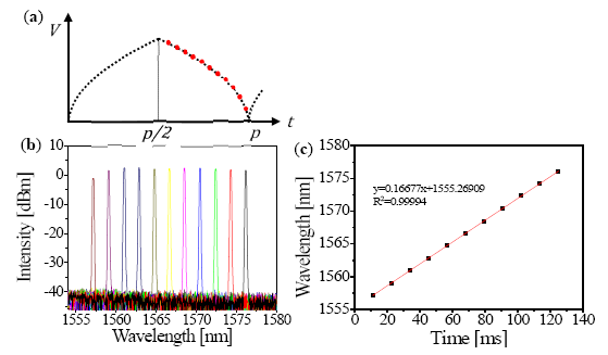 According to the programmed electrical driving signal that varies with the square root of the time with the time period of p (Figure 2a), we can experimentally demonstrate that the output wavelength linearly changed from 1557 to 1576 nm (Figure 2b). A broad tuning range of 19 nm can be obtained for the laser output by using static tuning of applied electrical signal state. We also measured an instantaneous line width and output power of 0.06 nm and 5 mW, respectively. The side-mode suppression ratio ranged from 45 to 50 dB. In addition, a highly linearized wavelength response was successfully extracted with an R-squared value of 0.99994, which is obtained from first order polynomial fitting as shown in Figure 2c, without any additional optical components such as optical interferometry for linearization during post-processing [16,18].
