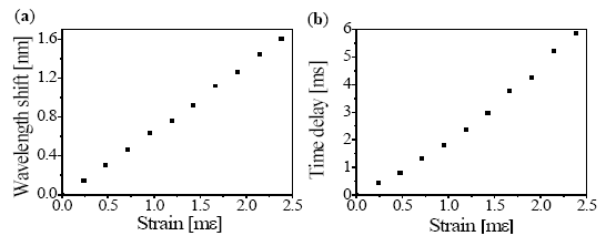 : A linearized wavelength-swept thermo-optic laser chip was applied to demonstrate a fiber Bragg grating (FBG) sensor interrogation system. A broad tuning range of 11.8 nm was periodically obtained from the laser chip for a sweep rate of 16 Hz. To measure the linear time response of the reflection signal from the FBG sensor, a programmed driving signal was directly applied to the wavelength-swept laser chip. The linear wavelength response of the applied strain was clearly extracted with an R-squared value of 0.99994. To test the feasibility of the system for dynamic measurements, the dynamic strain was successfully interrogated with a repetition rate of 0.2 Hz by using this FBG sensor interrogation system.1. Introduction