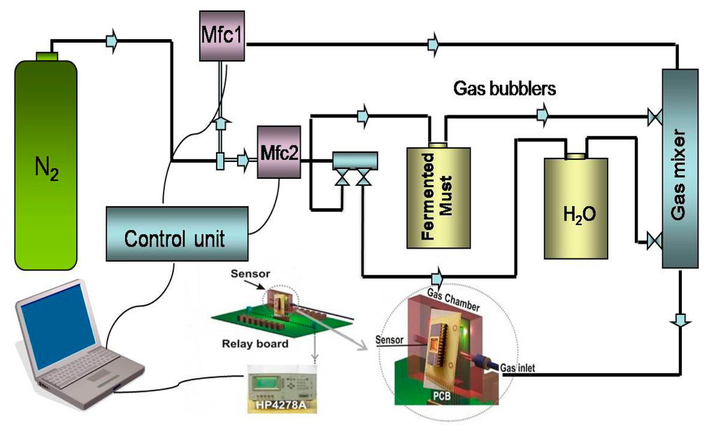 In the gas-delivery unit, initially a dry nitrogen flux is split into a carrier and a dilution part with the help of two mass flow controllers (Mfc). The carrier is bubbled through the liquid analyte of interest and subsequently mixed with the dilution flow. The experimental protocol is designed as follows: initially the carrier part passes through the bubbler containing water and when a sensor equilibrium response is reached, it passes with the same flow rate through the bubbler containing a sample of the fermented must. The characterization set up as follows: the setup shown in Figure 1 is placed in a temperature controlled chamber and all the measurements were performed at the same temperature of the fermentation process, 20 ± 1 °C. The gas delivery unit (mass flow controllers (Mfc1 and Mfc2), valves, temperature) is controlled with the appropriate built-in LabView software.