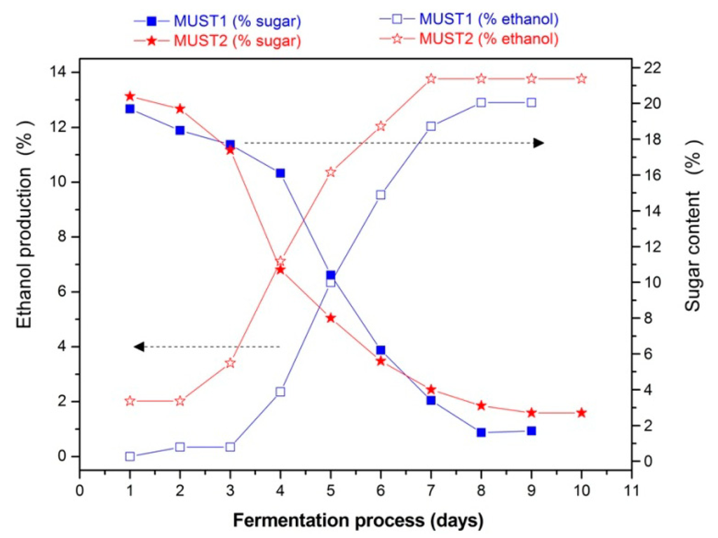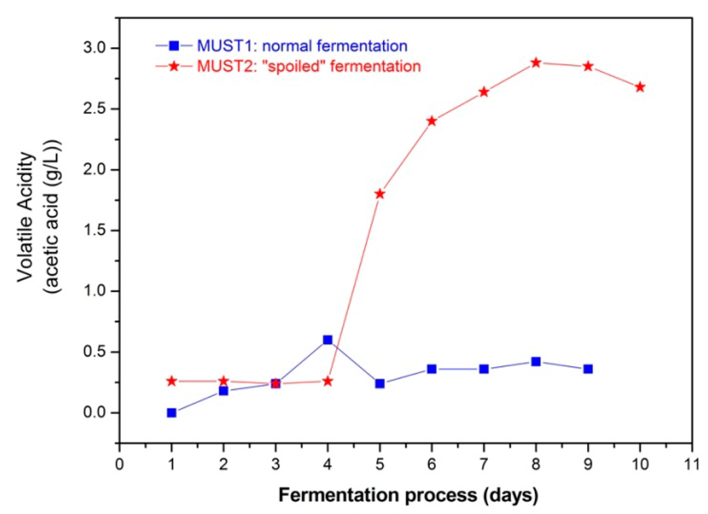 The evolution of the fermentation processes is determined by chemical analysis. Figure 3 shows the sugar consumption and the ethanol production during fermentation and Figure 4 the evolution of volatile acidity of the two fermenting musts. In the latter figure, the increase in volatile acidity from Day 5 of the process in Must 2, resulted from adding 2 g/L of acetic acid in the must. Finally, in Table 1 the initial and final volatile esters and total acidity are presented.