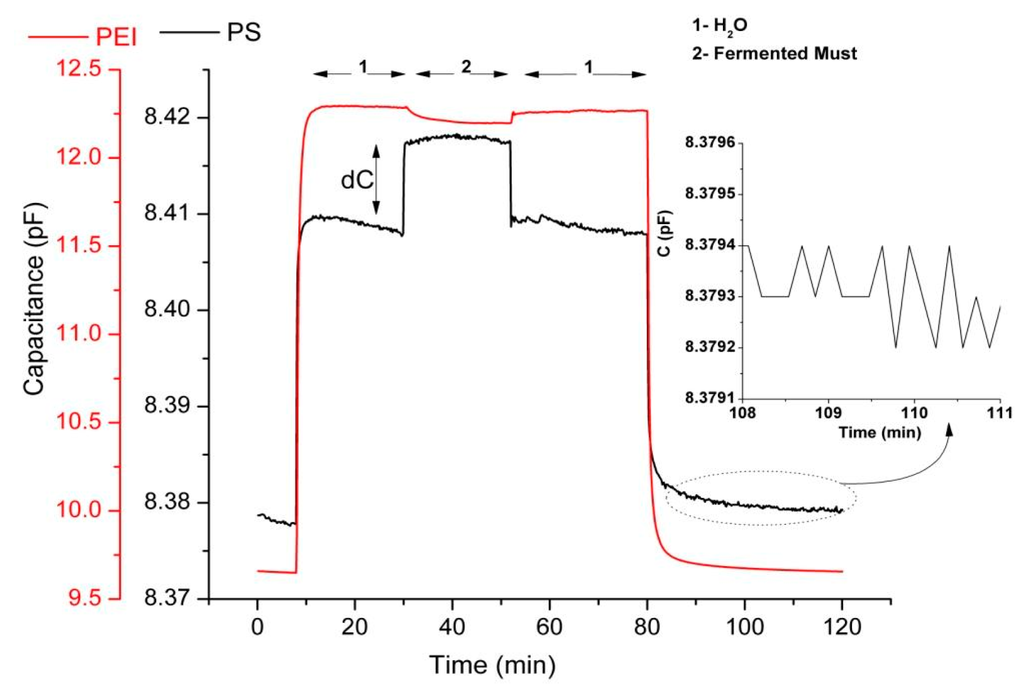 The fermentation process is a “live” ongoing process, meaning that the composition is changing with time. Every 24 h a sample is taken for the capacitance measurement and for the chemical analysis. Therefore, only one capacitance measurement is performed every day. A characteristic example of the dynamic responses of two sensors of the sensor array according to the described experimental protocol is presented in Figure 5. The responses recorded (which were also the input data for principal component analysis) are the differential equilibrium responses between the plateau capacitance value upon exposure to vapours of the examined sample (standard aqueous ethanol solutions or samples of the fermented must) and the plateau capacitance value upon exposure to vapours of pure water. By using pure water headspace as reference analyte we excluded the interference signal in the sensor response due to the high humidity concentration in fermented must (∼80% (v/v) in must and ∼85% (v/v) in wine). As shown in Figure 5 (zoom in), the measurement noise is approximately 0.0003 pF for the PS-coated sensor. Therefore, responses above 0.001 pF, according to acceptable signal to noise ratio (S/N ≥ 3), are readable. The equilibrium responses of each sensor to the headspace of the fermenting musts were recorded daily.