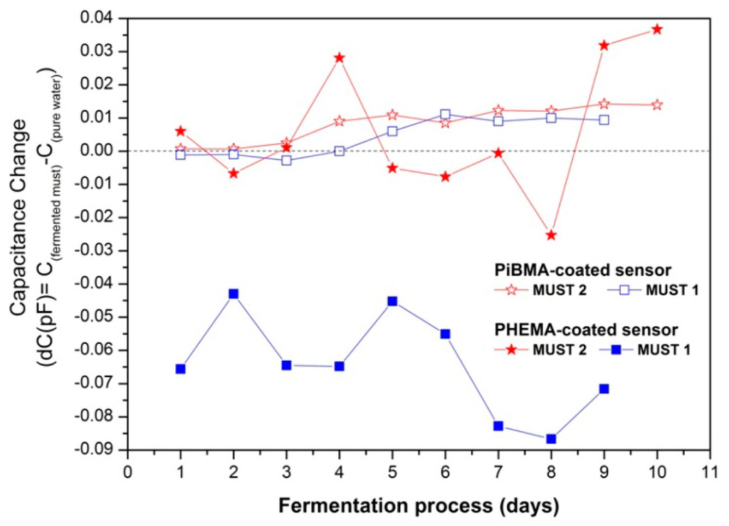 A sensor array consisting of eight IDCs coated with different polymeric materials is used for the monitoring and evaluation of alcoholic must fermentations. The selection of the polymeric materials was based on previous studies on the sorption capacity of different polymeric materials to various VOCs and on the responses of polymer-based chemocapacitor arrays upon exposure to different VOCs and humidity [34,35]. Two musts with distinctly different fermenting characteristics, according to chemical analysis, were monitored by the sensor array.