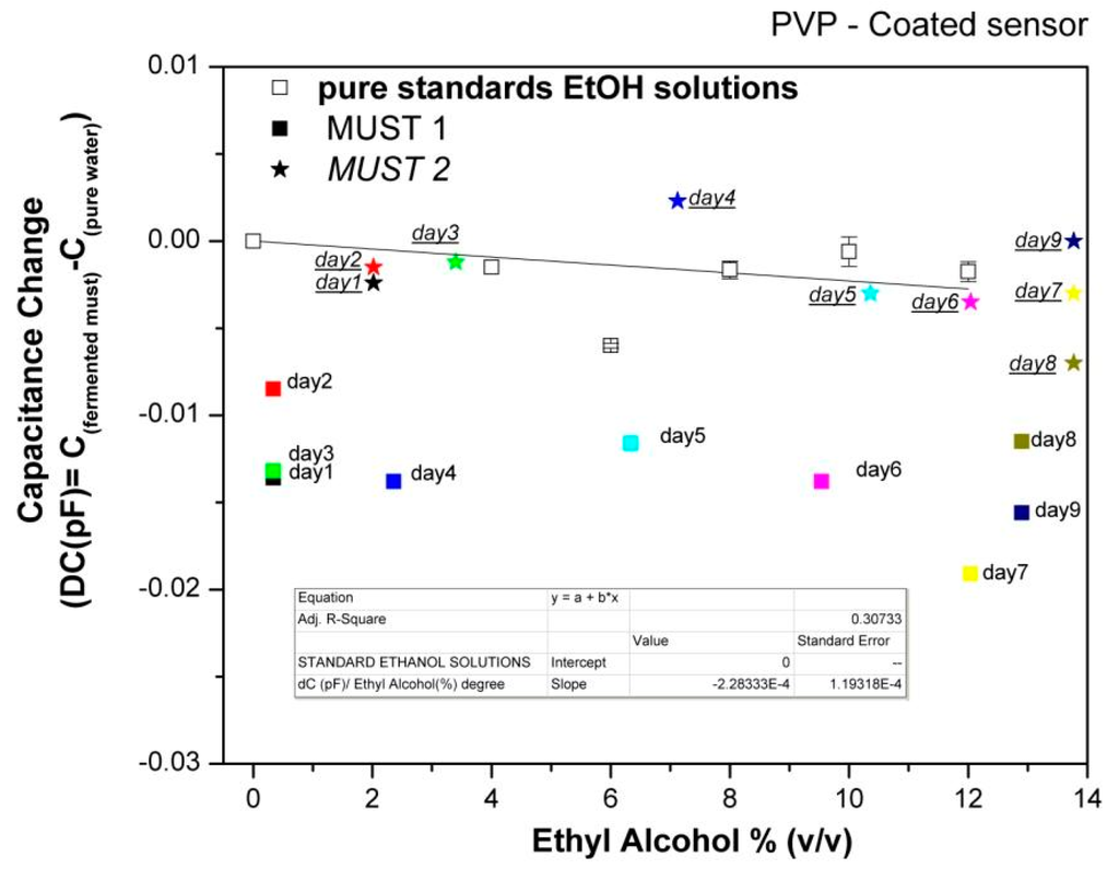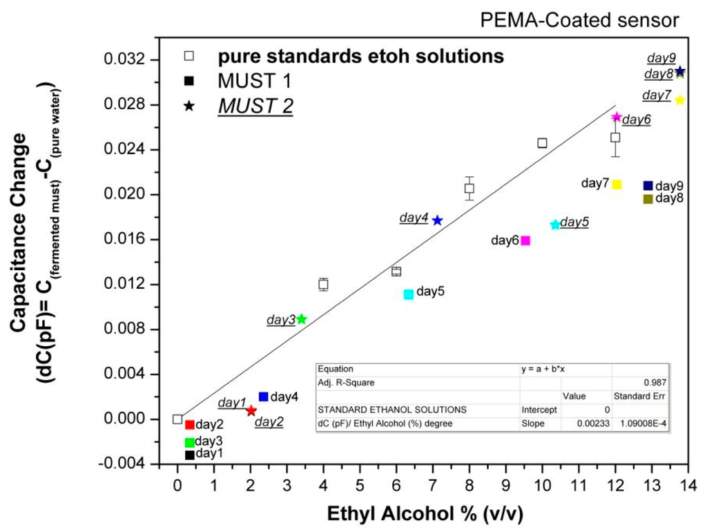 In order to further evaluate the array's responses to the fermenting musts, the capacitance data collected at each day of the fermentation process were plotted vs. the corresponding ethanol content of the musts, as deduced by chemical analysis, and compared with the sensor responses to pure ethanol solutions in the concentration range of 0%–12% (v/v). Characteristic examples are shown in Figures 7 and 8.
