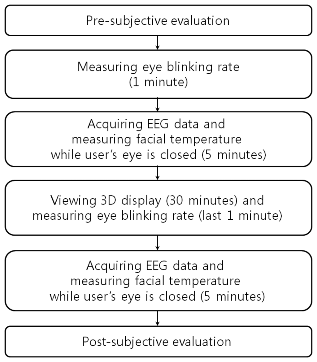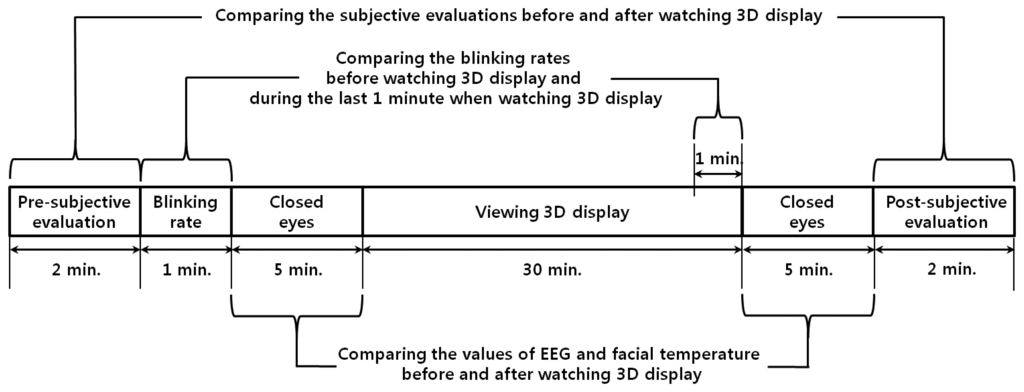 Figure 1 shows the experimental procedures used in our research. First, a SE was carried out in order to check the subject's condition before watching the 3D display. In order to measure the natural blink of the subjects, the eye BR was measured for 1 min. before the user was made to watch the 3D display. Also, prior to watching the 3D display, the user's EEG data and FT were measured for 5 min. with eyes closed in order to minimize visual stimuli. The subjects then watched the 3D display for 30 min. The eye BR was measured for the last 1 min of watching in order to compare the variations in the eye BR immediately before and after watching the 3D display. After watching the display, the EEG data and FT were again measured for 5 min. while the user's eyes were closed in order to minimize visual stimuli, and these measurements were used to compare the variations in the EEG and FT data. A SE was carried out to check the subject's condition after watching the 3D display.