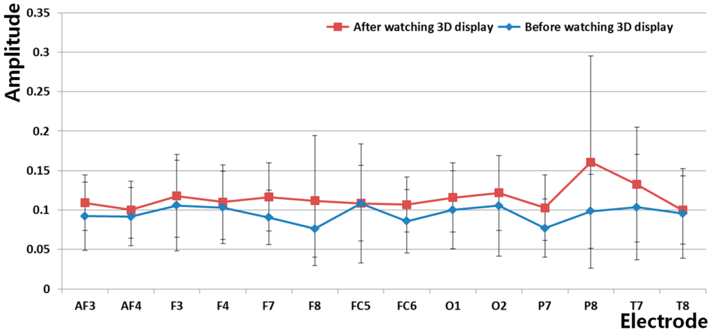Figure 10 and Table 4 show the measured amplitudes of the beta band of each electrode of the EEG signal before and after watching the 3D display. As shown in Figure 10, the amplitude of the beta band of each electrode is stronger after watching the 3D display than before watching the 3D display. The electrode that shows a significant difference before and after watching the 3D display was selected using the T-test, as shown in Table 4. The P7 of the lowest p-value (0.0795) of all the electrodes was selected, as shown in Table 4. Although the p-value of the P7 node is lowest as 0.0795, it does not show the significant difference with the confidence level of 95% or 99% because the p-value is larger than the thresholds for 95% (0.05) and 99% (0.01), respectively. This is because EEG signals contain noise that is caused by movements of the facial muscle. Nevertheless, we used the EEG signal of P7 node because its significant difference is relatively higher than those of other nodes, and the level of inter-correlations between each measurements of EEG, BR, FT, and SE score are measured as shown in Tables 8 and 9.