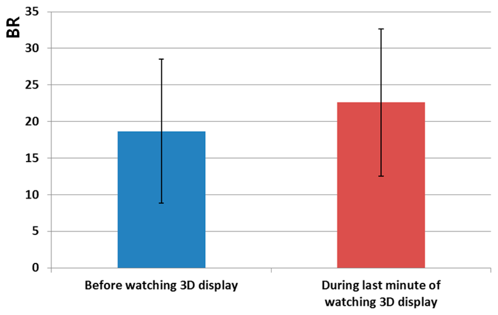Figure 11 and Table 5 show the measured eye BRs before watching the 3D display and during the last 1 min of watching the 3D display. As shown in Figure 11, the BR increased in the last 1 min of watching the 3D display compared to the value before watching the 3D display. The p-value is 0.2876, which is larger than confidence levels of 99% (0.01) or 95% (0.05). It is therefore difficult to say that there is a significant difference in the BR before watching the 3D display and in the last 1 min of watching the 3D display. The BR increased by 21.07% (100 × (22.6 – 18.667)/18.667) in the last 1 min of watching the 3D display relative to the value before watching the 3D display, as shown in Table 5.