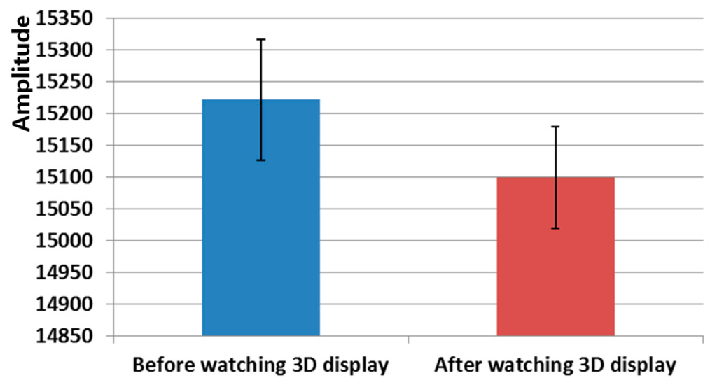 As shown in Figure 12 and Table 6, the amplitude of the FT decreased after watching the 3D display compared to the value before watching the 3D display. The p-value is 0.00089, which is much less than the confidence level of 99% (0.01). We can therefore deduce that there is a significant difference in the FT amplitudes before and after watching the 3D display.