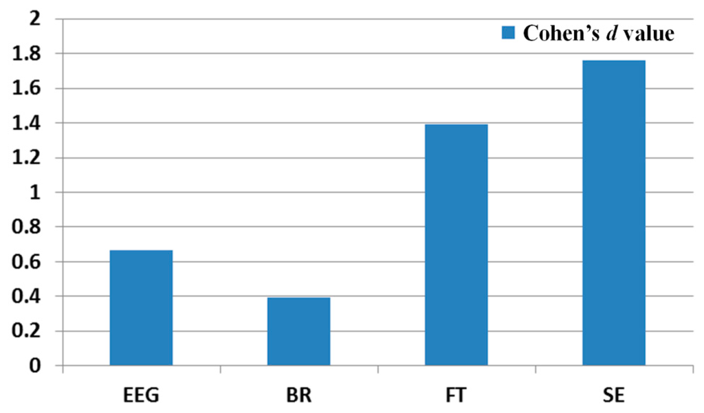 Based on the p-value and Cohen's d value, we find that the difference between the SEs before and after watching the 3D display is largest. In addition, the differences between FT, EEG, and BR are second, third, and fourth largest, respectively.