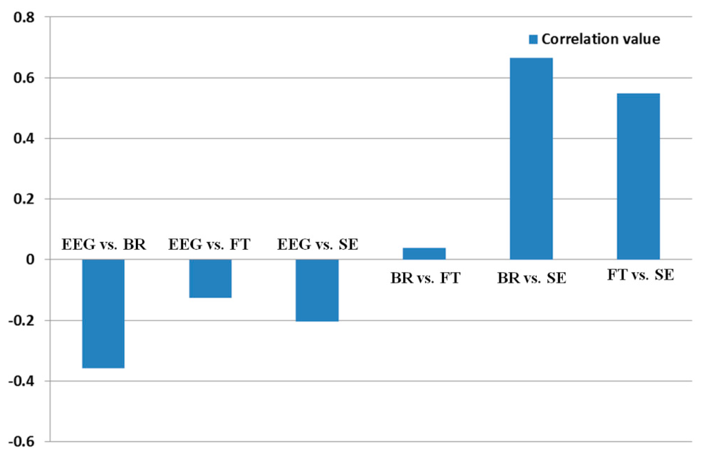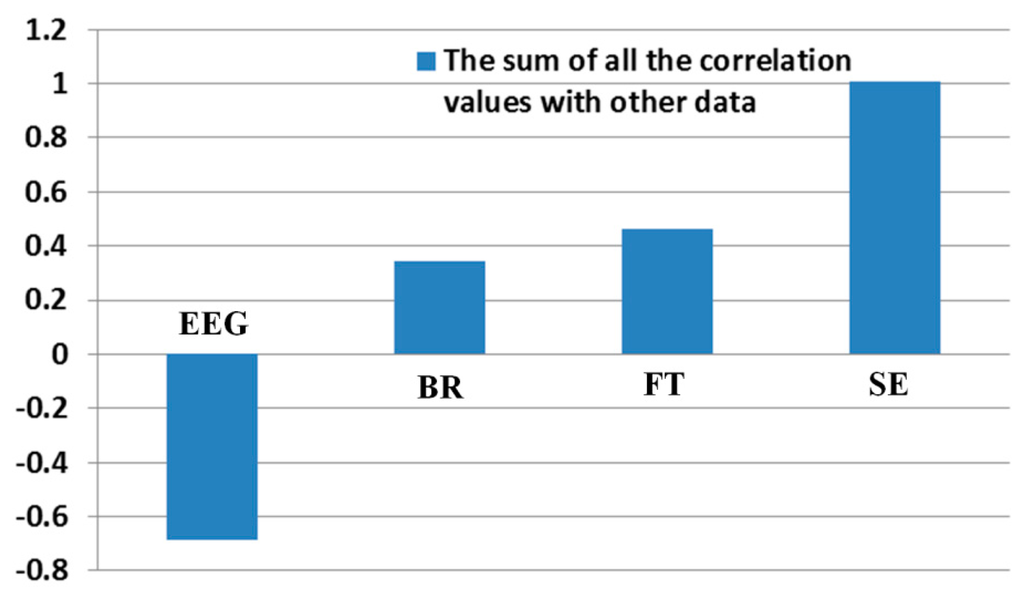 In order to quantitatively assess the individual correlations and the consistency of one data with others, we calculate the summed value of all the correlation values excluding the auto-correlation value of 1 (for example, correlation value between EEG and EEG). As shown in Table 9 and Figure 15, the correlation of SE with other data is highest based on the largest sum of 1.0092. In addition, those of the FT, BR, and EEG with other data are second, third, and fourth highest, respectively.