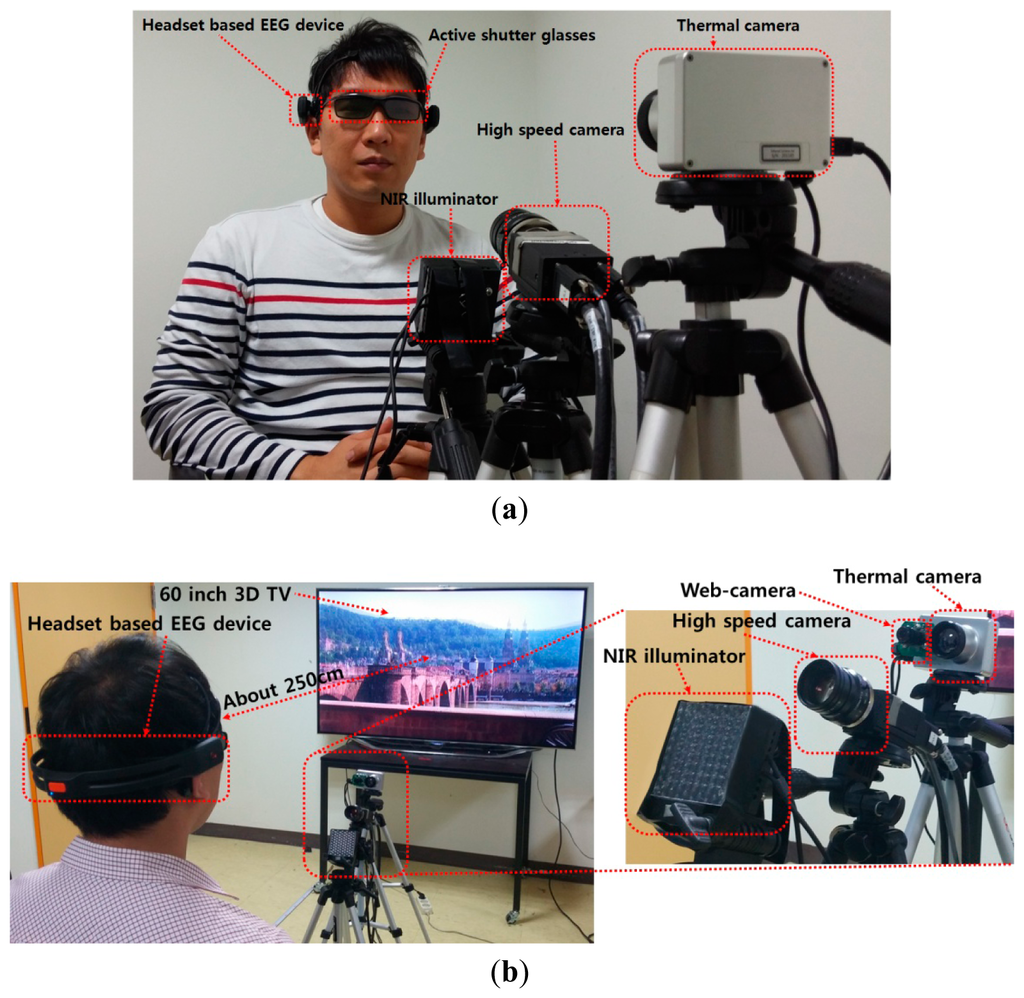As shown in Figure 2a, a user wears both a headset-based EEG device and active shutter glasses [] for the experiment. As shown in Figure 2b, the user wearing shutter glasses and the EEG device watches 3D content shown on a 60-inch smart TV with a display resolution of 1920 × 1080 pixels. In order to assess eye fatigue, we measured the EEG signals, eye BR, and FT using the EEG device, high speed camera [], and thermal camera [], respectively.