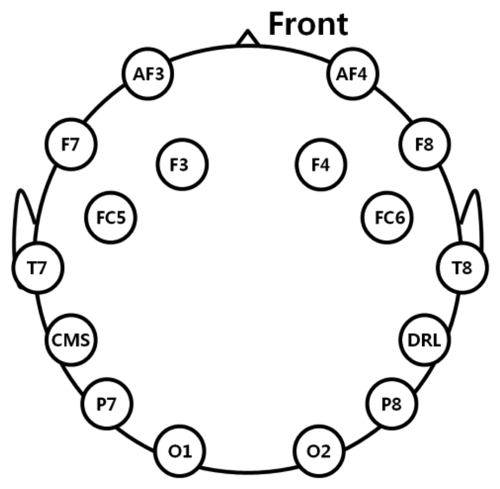 We used a commercial EEG device with a low-cost Emotiv EPOC headset that consists of 16 electrodes, including two reference nodes for measuring EEG signals [], as shown in Figure 2. The placement of electrodes complies with the international 10-20 system like previous researches [,], as shown in Figure 3. EEG data were processed using a built-in digital 5th-order Sinc filter. The sampling rate of the Emotiv EPOC system was 128 Hz (128 samples/s) [,].