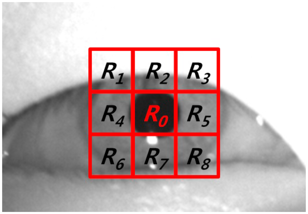 With the captured image, the region of the corneal specular reflection is located using image binarization. Two areas of the eyes are detected based on the detected region of the corneal specular reflection using sub-block based template matching, which is based on the scheme of integral images in order to reduce the computational complexity []. The means of each sub-block (R0 ∼ R8) are calculated as shown in Figure 4, where R0 and R1 ∼ R8 represent the candidate pupil regions and its neighboring ones, respectively. The mean of the gray value of the pupil region is usually lower than those of the other regions. Therefore, the mean of the gray value of Ro in the candidate pupil region is compared with the means of the gray values of R1 ∼ R8 in the neighboring regions, as shown in Figure 4. The sum of the difference of the mean values of R0 and the neighboring regions (R1 ∼ R8) is then calculated. In order to find the pupil position for which the sum of the difference value is a maximum, the 3 × 3 mask in Figure 4 moves by the overlapping of one pixel. Within the area detected by the sub-block-based template matching, the boundary of the pupil is located using the ellipse fitting method, as shown in Figure 5a. For closed eye, as shown in Figure 5b, the ellipse fitting method fails, whereas for opened eyes, the ellipse fitting method is successful. We are therefore able to differentiate between images with both open and closed eyes, and the eye BR is counted based on the number of images with closed eyes during a one-minute interval.