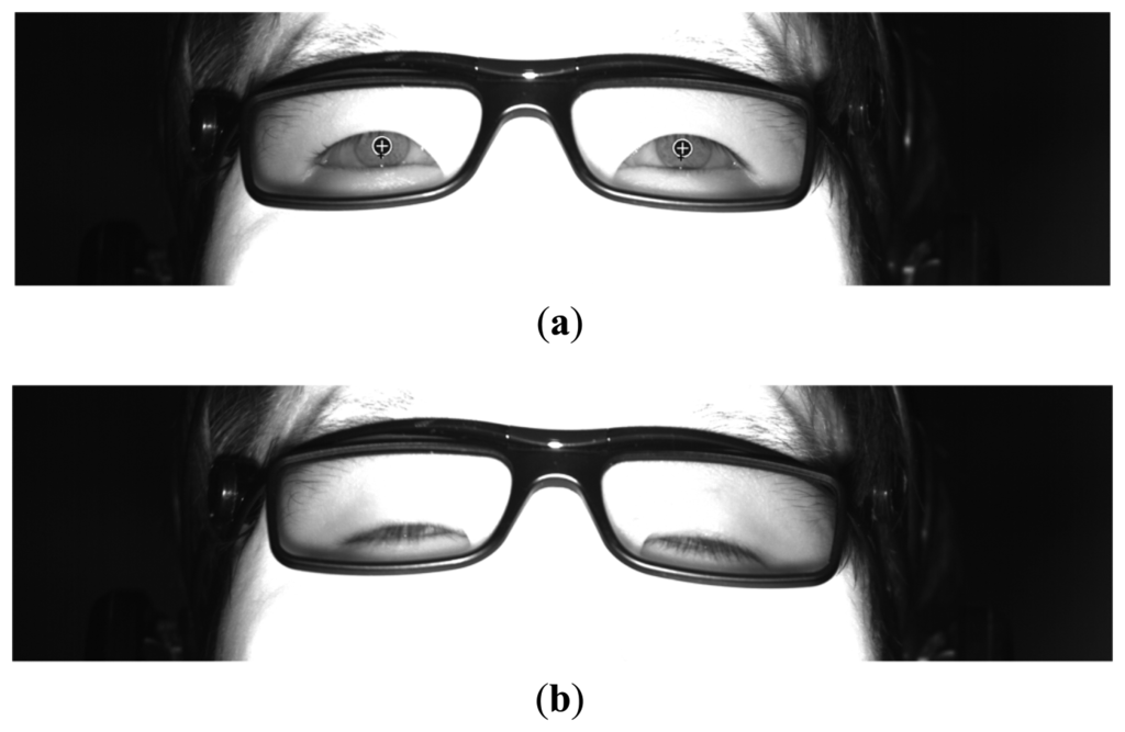 A high-speed camera of 4 mega pixels was used to measure the eye BR and to acquire both images of both eyes. The camera acquires images with a resolution of 2048 × 2048 pixels at a speed of 150 fps []. However, the actual acquisition speed of images is much lower than 150 fps because of the larger amount of data to be transmitted from the camera to the computer, and then to be written to the hard disk. In order to improve the image acquisition speed, a cropped image with 2048 × 512 pixels (including both eyes) is captured. To enhance the accuracy of the detection of the pupil region, a near infrared (NIR) illumination of 850 nm was used, as shown in Figure 2b, which does not dazzle the user's eye [].