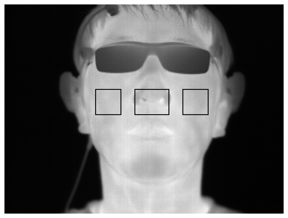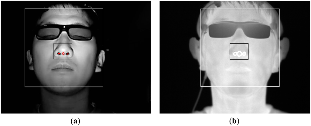 The web-camera captures the image with the NIR illuminator. The reason for using the NIR illuminator is to detect the face and nose in a manner that is robust to variations in illumination. As shown in Figure 6a, the detection of the face region is achieved by the adaptive boosting (Adaboost) method [], and the center of both nostrils based on the detected face region is located using binarization. The regions of the face and center of the nose are defined in the thermal camera image based on the regions of the face and center of the nose in the web-camera image, as shown in Figure 6b.