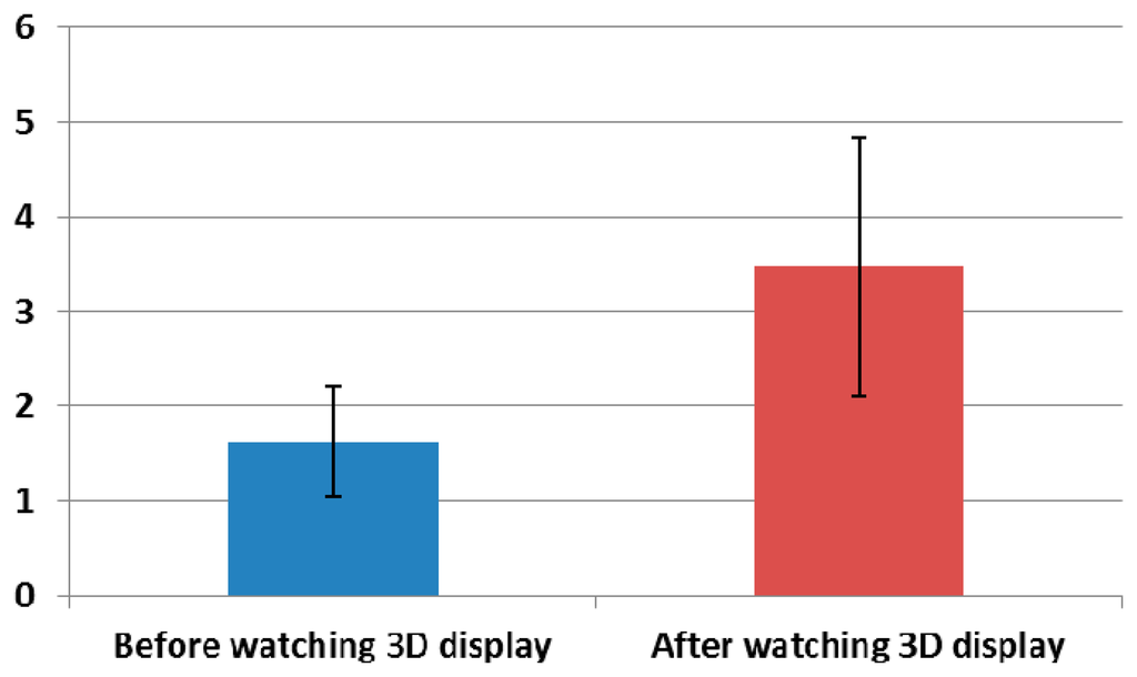 The average SE score after watching the 3D display is observe to be higher than that before watching the 3D display, as indicated by Figure 9 and Table 3. The statistical analysis was performed using an independent two-sample T-test [], which is widely used as a statistical hypothesis test. The calculated p-value is 0.0001, which is less than the confidence level of 99% (0.01). The null-hypothesis (the two average scores of SEs before and after watching the 3D display are the same) is rejected, and the two scores of SE before and after watching the 3D display are significantly different [].