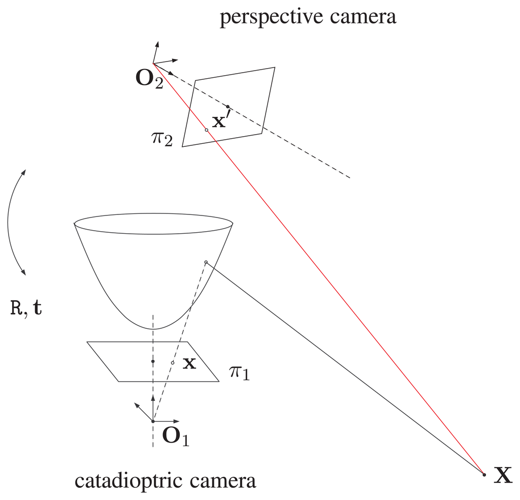 Suppose a light ray from the 3D point X reflected by the hyperbolic mirror of the catadioptric camera intersects the image plane π1 at point x. The point correspondence x′ on the image plane π2 can be modeled by a coordinate transformation R, t from O1 to O2. If the focal length or sensor resolution of the cameras are different, then an additional internal transformation for the perspective camera needs to be carried out. Thus, the 3D point X can be uniquely determined by the point correspondences x and x′.