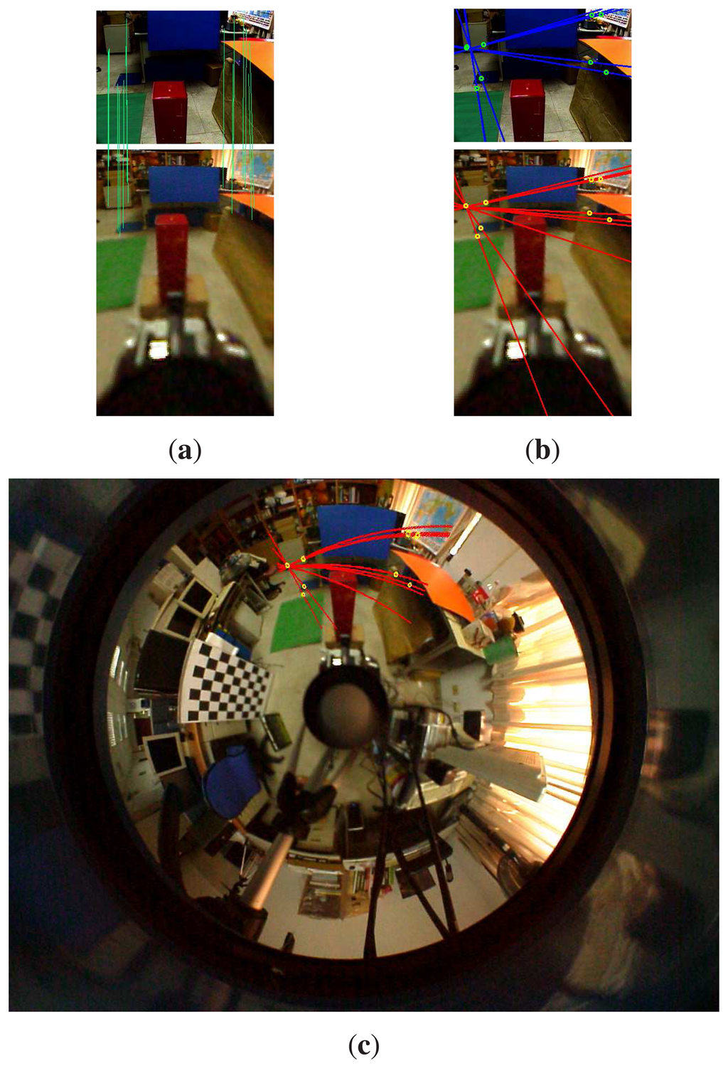 Figure 10 illustrates the epipolar geometry of the hybrid omnidirectional and perspective imaging system. Consider the case that the virtual camera is constructed to have the same orientation as the perspective camera. Figure 10a illustrates the correspondence matching between the perspective image and the virtual image derived from the omnidirectional image. The rotation between the two cameras estimated by these point correspondences is very close to the calibration result. If their optical axes are not perpendicular to the stereo baseline, then the epipoles will lie on the image planes, as illustrated in Figure 10b. Although the epipolar lines can be easily derived from the epipolar geometry of a stereo rig, they correspond to the quadric curves in the omnidirectional image, as shown in Figure 10c. Thus, the stereo matching is greatly simplified on the virtual and perspective image pair, even if they are not rectified to the fronto-parallel configuration.