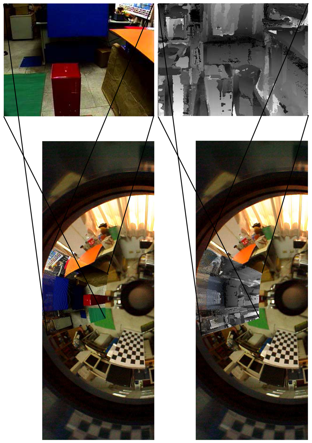 Figure 11 illustrates the matching results on the perspective and omnidirectional image pair. A specific region of interest captured by the perspective camera (as shown on the top) is used for stereo matching and depth reconstruction. The depth map is then transferred to the common region in the omnidirectional view for global depth perception. As shown on the bottom of Figure 11, the misalignment on the region of interest is due to the parallax between the omnidirectional and perspective cameras. Figure 12 shows another experiment with the input hybrid stereo image pair, epipolar geometry, image rectification and disparity maps (see the captions for more details).