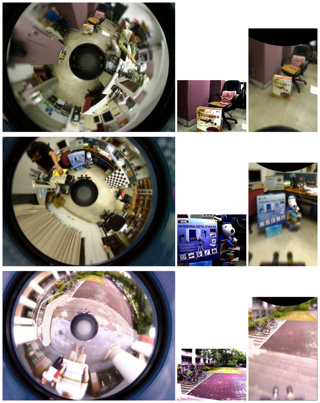 Image rectification for the perspective camera can be performed with a straightforward linear warping technique provided that the intrinsic and extrinsic parameters of the camera are available [29]. The generation of virtual perspective images from an omnidirectional image, however, is not a simple one-to-one linearmapping. As described in Section 2.2, the catadioptric image formation can bemodeled by a unifying projection with a two-step linear mapping via a unit sphere. Thus, the virtual images can be synthesized by back-projecting the rays from the omnidirectional image.