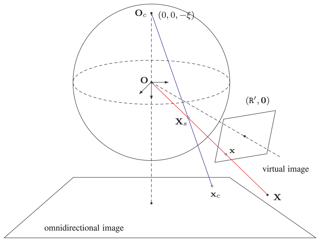 Using the unit sphere projection model, a 3D scene point X is first projected to a point Xs on the unit sphere located at the origin O of the unifying catadioptric projection model. The point Xs is then projected perspectively via a projection center Oc located inside the unit sphere to the image plane of the lens camera. For a general catadioptric imaging system, the optical axis of the lens camera is aligned with the line determined by the two centers of projections O and Oc. Let the point Xs be represented by (Xs ,Ys, Zs, 1)⊤ in homogeneous coordinates, then the projection of the 3D scene point X on the image plane is given by: