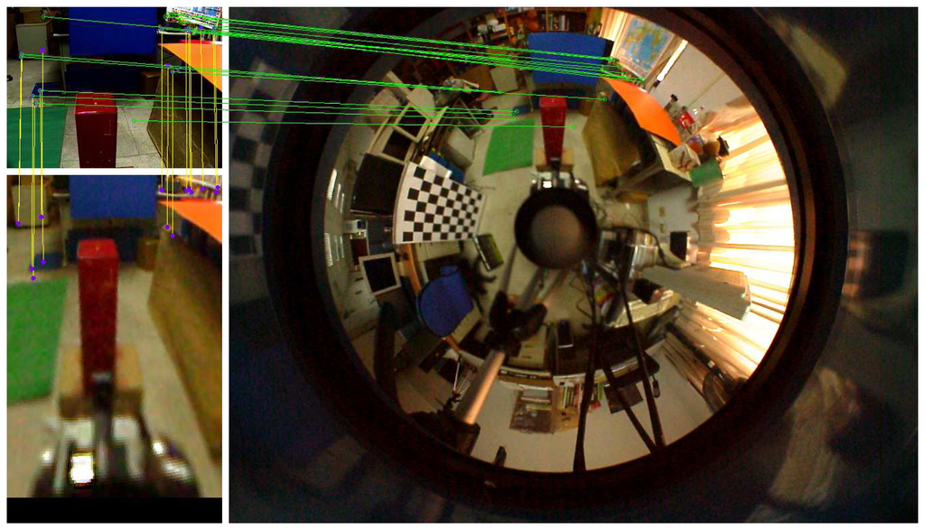 To find the point correspondences between the omnidirectional and perspective images, the SIFT descriptor is adopted for feature matching [34]. Since unwarping the omnidirectional image to a panoramic form generally increases the searching range, the correspondence matching is carried out on the original hybrid stereo image pair. The search region is further reduced with the knowledge of an approximate orientation of the perspective camera. For example, the searching range on the omnidirectional image can generally be restricted to less than a quarter of the image, depending on the field-of-view of the perspective camera. An example of the feature correspondence matching between the omnidirectional and perspective images is illustrated in Figure 4.