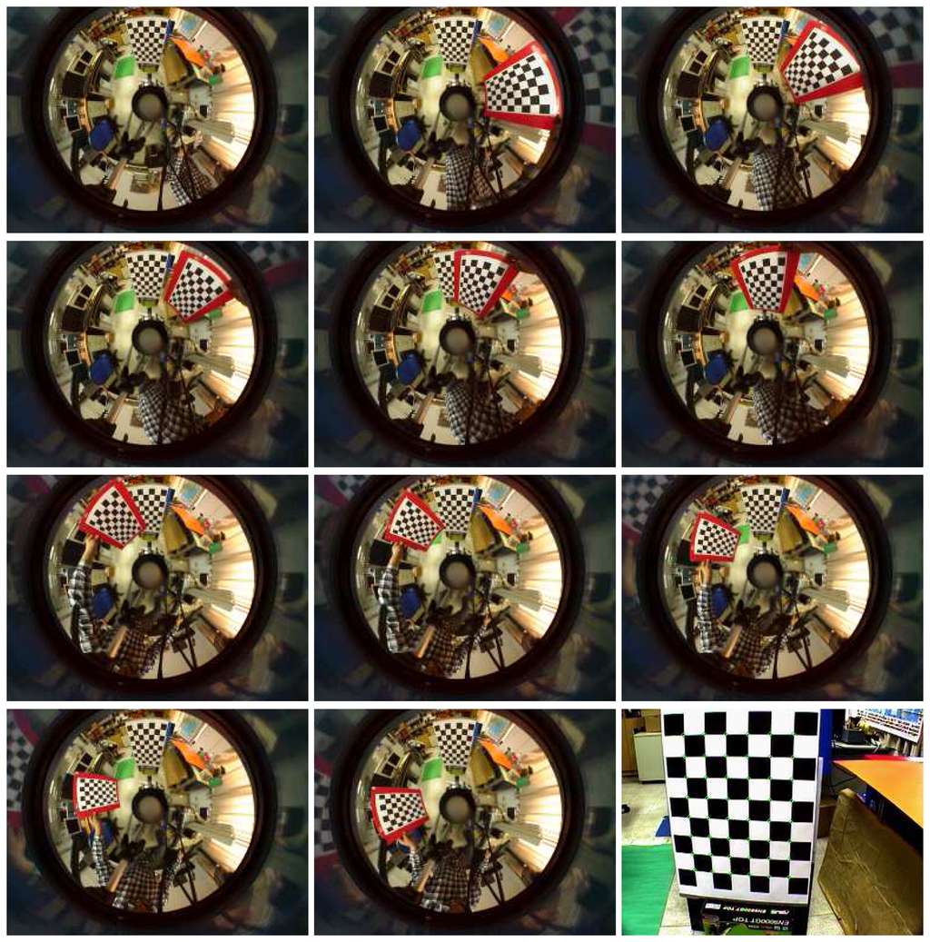- Mei, C.; Rives, P. Single View Point Omnidirectional Camera Calibration from Planar Grids. Proceedings of the 2007 IEEE International Conference on Robotics and Automation, Roma, Italy, 10–14 April 2007; pp. 3945–3950.