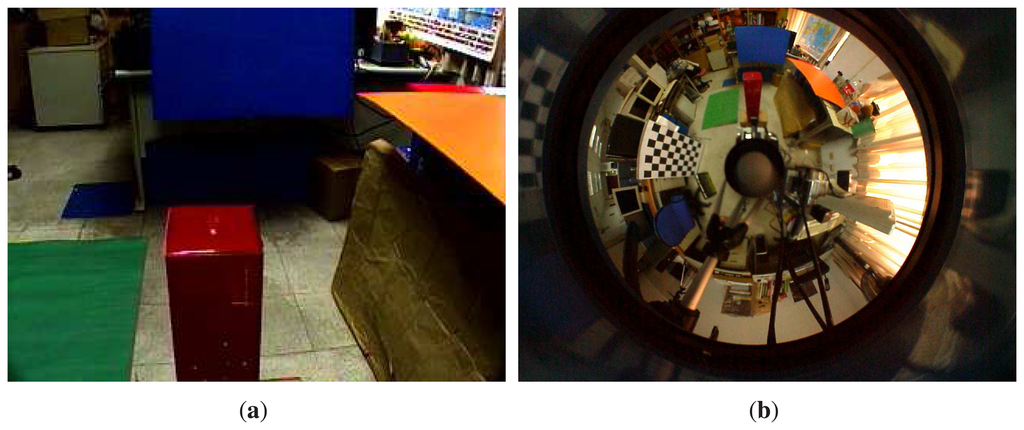 We have performed a number of experiments to assess the effectiveness of the proposed generalized stereo model for the hybrid imaging system. The hybrid camera system, which consists of a Watec-221s analog camera and a SONY DFW-X710 digital camera with an attached hyperbolic mirror, is mounted on a mobile robot, as shown in Figure 5. The image resolutions of the cameras are 320 × 240 and 1024 × 768, respectively. All images were acquired with white-balancing and auto-exposure. The perspective camera equipped with a Tamron 12VM612T lens provided a field of view of 30.4° × 23.1°. The intrinsic and extrinsic parameters of the camera system are obtained as described in Section 4. Figure 6 shows the captured omnidirectional and perspective images used for system calibration. The experimental environment and the acquired hybrid stereo image pair are shown in Figures 7 and 8, respectively.