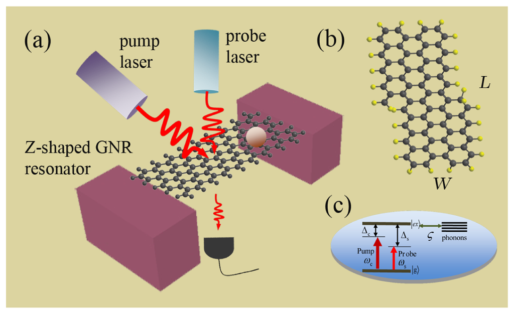 Recently, graphene-based transistore have also been achieved experimentally [14–18]. Nevertheless, although graphene behaved as semimetal, monolayer graphene is a zero-bandgap nanomaterial, and a few applications requiring a bandgap will be limited due to this intrinsic property. Quasi-one-dimensional graphene nanoribbon (GNR) can exhibit a bandgap via quantum confinement, which has been demonstrated recently [19,20], and a number of various experimental techniques have been developed to fabricate GNRs [20–22]. There has been substantial progress towards the goal of controlling the GNRs edge termination with armchairs and zigzag edge geometries at present [23,24]. Since GNRs have a tunable bandgap sensitive to the size and geometry, they are good candidates for possible electronic and optical devices. Here, we will firstly present an optical transistor based on the GNR-optomechanical system (concrete descriptions are given later in the Results and Discussions).