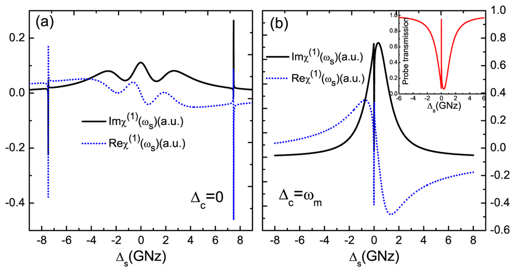 We consider a Z-shaped GNR of dimensions (L, W) = (14.1,0.7) nm (L and W indicate the length and width of the GNR resonator, respectively) composed of 424 carbon atoms [33,50] with an ambient temperature of 10 K. The model is shown in Figure 1, and the parameters of GNR resonator are shown as follows [33,50]: the fundamental vibration frequency is ωm = 7.477 GHz; the quality factor is Q = 9,000; the decay rate γm = ωm/Q; the effective mass is M = 0.73 × (424mC + 140mH) = 6340 yg (mC = 1.993 yg, mH = 1.674 yg) (1 yg= 10−27 kg); the exciton dephasing rate Γ2 = 1 GHz; and the exciton-resonator coupling strength is about ζ = 0.09 [43]. In Figure 2a, we first show the imaginary part (Imχ(1)) and the real part (Reχ(1)) of linear optical susceptibility as functions of probe-exciton detuning Δs = ωs − ωe at the detuning of the exciton frequency and the pump frequency Δc = 0, which corresponds to the absorption and dispersion of the probe laser, respectively. From the curves, we find that there are two sharp peaks at both sides of the spectra that just correspond to the vibrational frequency of the GNR resonator, and the middle parts indicate the absorption and dispersion of the exciton in the GNR resonator. The physical origin of the phenomenon has been demonstrated in a coupled nanomechanical resonator system [32]. In the case of red sideband Δc = ωm, the imaginary part and real part of linear optical susceptibility exhibit zero absorption and a positive steep slope at Δs = 0, as shown in Figure 2b. Furthermore, at the red sideband, an analogous phenomenon of optomechanically-induced transparency [36] will appear in the system, and we term it as phonon-induced transparency (PIT) [51], as shown in the inset of Figure 2b. This is due to mechanically-induced coherent population oscillation when the pump-probe detuning equals the GNR resonator frequency [32].