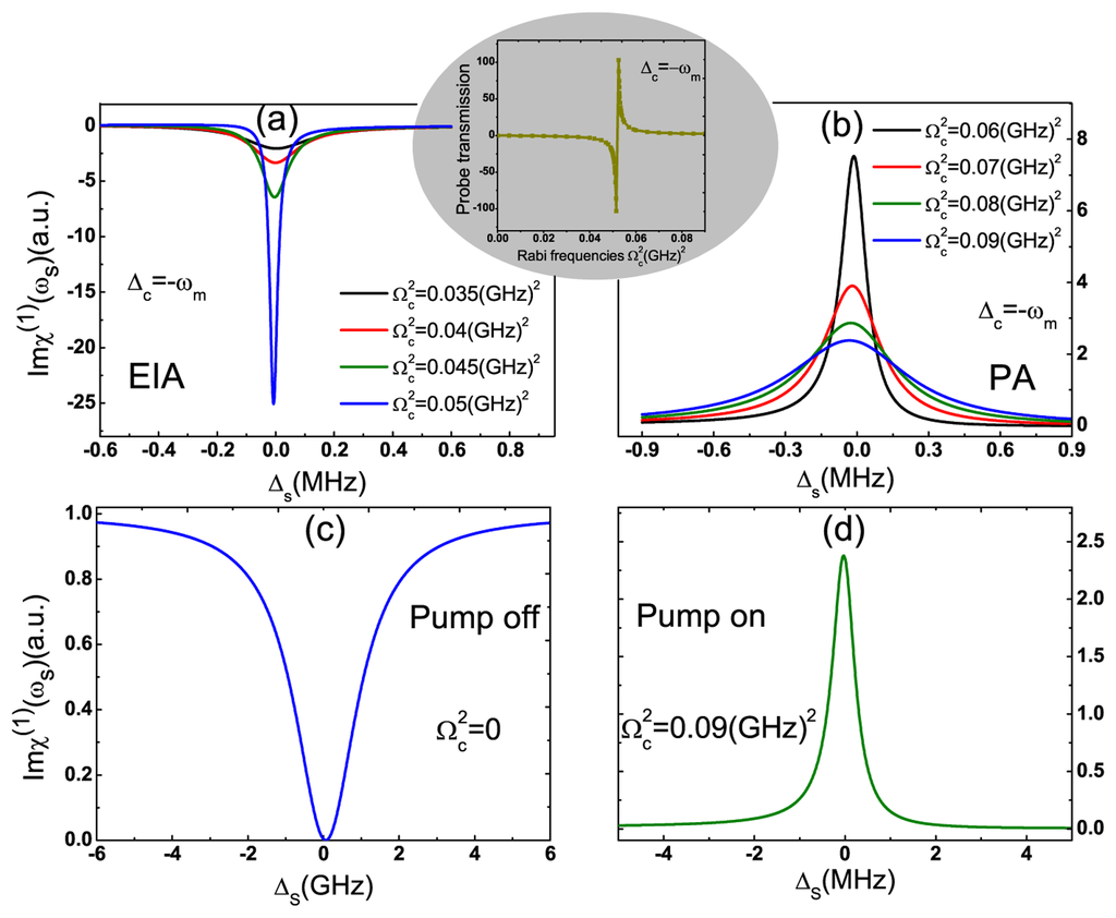 Switching the pump-exciton detuning to the blue sideband Δc = −ωm and increasing the pump field intensity, the probe transmission displays a deeper dip, as shown in Figure 3a. In Figure 3a, the negative transmission of the probe laser with the increase of the pump intensity is the so-called electromagnetically-induced absorption (EIA) [52]. However, with further increasing the pump laser intensity, the system switches from EIA to parametric amplification (PA), resulting in the probe laser amplification, as shown in Figure 3b, which has been demonstrated in the conventional optomechanical system [52]. The elliptical inset in Figure 3 shows that there exists a turning point among and , which switches the probe transmission from EIA to PA. Therefore, the GNR resonator system cannot only switch the weak probe laser from off to on, but can also serve as a quantum optomechanical transistor due to the probe amplifier effect. Turning off the pump laser, the weak probe laser displays the transmission spectrum owning to the usual exciton absorption resonance, as shown in Figure 3c. However, turning on the pump laser and fixing the pump-exciton detuning Δc = −ωm, the dip switches to a transmission peak immediately, as shown in Figure 3d. This amplification comes from the quantum interference between the phonons and the beat of the two optical fields via the exciton in the GNR resonator. Due to dressing with the phonon modes, the original two levels of excitons in the GNR resonator system split into several metastable levels. When applying a strong pump laser to the system, the electrons can transit between the metastable levels, which induces the constructive interference and eventually amplifies the weak probe laser.