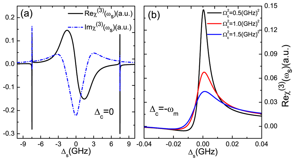 Inserting these operators into Equations (3)–(5) and neglecting the nonlinear terms, solving the equation set and working to the lowest order in Es, but to all orders in Ec, the linear optical susceptibility can be derived as , where Σ1 = μ2/(ħΓ2) and χ(1)(ωs) is given by: