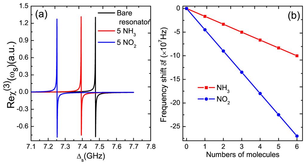 On the other side, to realize the application in mass sensing is the primary goal for the research of GNR resonator systems. In order to implement mass sensing, the first step is to determine the original frequency of the GNR resonator. In Figure 4a, we find that the two sharp peaks induced by the exciton-resonator coupling in the GNR resonator locates accurately at the resonator frequency Δs = ±ωm. This indicates a nonlinear optical scheme for measuring the frequency of the GNR resonator. The physical origin of this result is due to mechanically-induced coherent population oscillation, which makes quantum interference between the resonator and the beat of the two optical fields via the localized exciton when the probe-pump detuning is equal to the resonator frequency. Therefore, if we tune the pump beam properly and scan the probe frequency across the exciton frequency in the spectrum, we can easily obtain the accurate vibration frequency of the GNR resonator. The implementation of the nanomechanical mass sensor depends on monitoring the resonance frequency variation of a nanomechanical resonator when additional mass is adsorbed onto its surface. Once additional mass is deposited on the surface of the resonator, the new frequency of the resonator can be measured, then additional mass can be determined straightly via Equation (10). Here, we propose a nonlinear optical mass sensing via using the Kerr coefficient based on the GNR resonator system. In Figure 5a, we first deposit five NH3 molecules on the GNR resonator and measure the new frequency of the resonator. There is a frequency shift δf1 = 83.5 MHz (see the red curve) compared with the bare resonator without depositing any molecules (see the black curve) onto it. Similarly, five NO2 molecules can also be estimated via the frequency shift δf2 = 225.2 MHz in the probe nonlinear Kerr spectroscopy (see the blue curve). Figure 5b shows the linear relationship between the frequency shifts and the number of deposited molecules. The negative slope gives the mass sensitivity of the resonator. In this way, once the frequency of the resonator is determined, the mass of the resonator can also be obtained accurately via the slope.