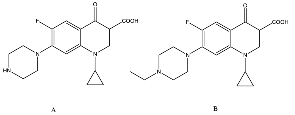 Ciprofloxacin (CIP, Figure 1A) is the most commonly used FQ for the treatment of urinary tract infections. The effects of CIP residues are lower respiratory tract infections, nosocomial pneumonia, skin infections, and chronic bacterial prostatitis [4–7]. The widespread use and possibility of abuse or misuse of FQs in agriculture and aquaculture has resulted in the potential presence of residues of these compounds in foodstuffs of animal origin, which has given rise to public health concerns over their toxic effects, development of resistant strains of bacteria, and allergic hypersensitivity reactions [8–10]. Because of the concerns about drug residues entering the food chain and contributing to bacterial resistance, the use of antibiotics in livestock is strictly regulated and maximum residue levels (MRLs) have been established. In the European Union MRLs has been set for enrofloxacin and ciprofloxacin in milk (100 ng/mL) by Council Regulation EEC/2377/90. Consequently, there is a growing demand for easy, rapid, and economical methods to detect and manage FQ residues in foodstuffs.