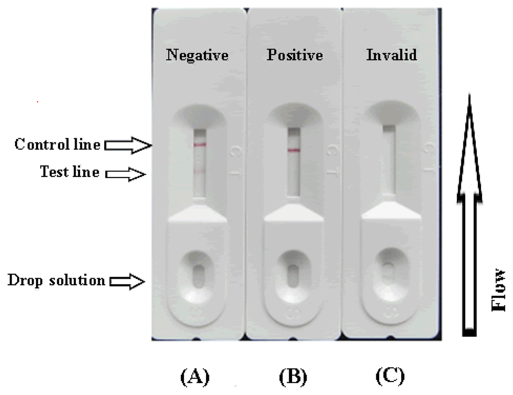 To assure that the test strip will work correctly, the flow must also reach the control line, which has goat anti-mouse IgG embedded in it, and create an indication as well. This control should always appear in a successful test, while the test line will only appear when the sample is negative (Figure 2A). A positive result could be indicated only if the control line appears (Figure 2B), if control line doesn't appear or only the test line appears (Figure 2C), which suggests that the testing procedure was incorrect or the strip was invalid, indicating that the test should be repeated using a new strip.