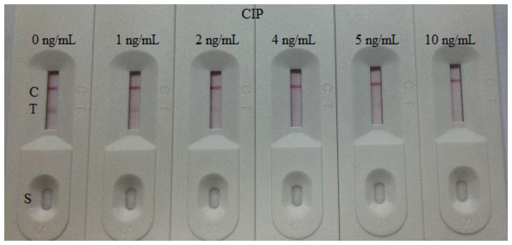 Because of its rapid and simple performance with high throughput and sensitivity, the colloidal gold-based immunochromatographic strip test can be applied to the detection of CIP. This method also allowed the detection of CIP at low concentration levels and permitted multiple dilutions of high sample concentrations, which is useful for research and practical purposes. The CIP strip test can be completed within 3 min in only one step and with an easy procedure and equipment. As this method provides only preliminary qualitative results, determined positive samples should be further confirmed by some more accurate and quantitative method such as HPLC, LC-MS/MS or an ELISA method.