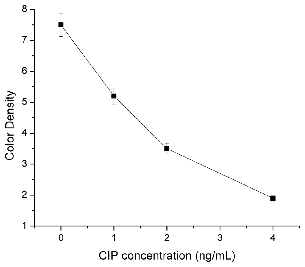 The sensitivity of the test strip was determined by testing some CIP reference samples. CIP was diluted at concentrations of 0, 1, 2, 4, 5, and 10 ng/mL in 0.01 M PBS (pH 7.4) and then the detection limit was determined. The concentrations of CIP structural analogues ENR and NOR were 0, 1, 5, 6, 7, 8, and 10 ng/mL, NDF and DANO were 0, 1, 5, 6, 7, 7.5, 8, and 10 ng/mL, PEX and LOME were 0, 5, 8, 10, 15, and 25, ENO were 0, 10, 25, 40, and 50 ng/mL, and SAR were 0, 10, 25, 40, 50, 80, and 100 ng/mL, respectively. The blank sample was the dilution buffer (0.01 M PBS). Two drops (80 μL) of the solution were added on the sample pad of the strip separately with a micropipette. Three minutes later, the test strip reader recorded the color depth of the different strips. The lower detection limit (LDL) with naked eyes was defined at the amount of CIP producing a clearly visible difference in intensity of the test device in comparison with the 0 ng/mL (blank sample). Six repeat samples analyzed on a single day were tested at each concentration [24,25].