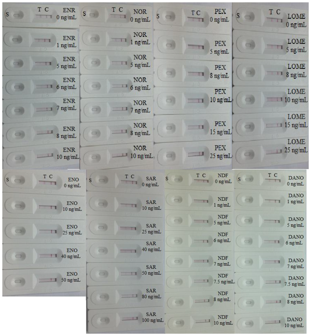 The cross-reaction of the assay was determined by running ENR and NOR at concentrations of 0, 1, 5, 6, 7, 8 and 10 ng/mL, NDF and DANO at concentrations of 0, 1, 5, 6, 7, 7.5, 8, and 10 ng/mL, PEX and LOME at concentrations of 0, 5, 8, 10, 15, and 25 ng/mL, ENO at concentrations of 0, 10, 25, 40, 50 ng/mL and SAR at concentrations of 0, 10, 25, 40, 50, 80, 100 ng/mL. As shown in Figure 6, there was no color at the test line position in the different CIP strips expect in the 0 ng/mL strip. Nevertheless, the ENR and NOR samples presented a weak color in all test strips, a strong color at 0 ng/mL and no color at 7 ng/mL. The NDF and DANO samples presented a weak color at 1, 5, and 6 ng/mL and no color at 7.5 ng/mL (NDF) and 10 ng/mL (DANO), respectively. Meanwhile, the PEX and LOME samples also presented strong color at 0, 5, and 8 ng/mL, weak color at 10 ng/mL and no color at 15 ng/mL (PEX) and 25 ng/mL (LOME). The ENO sample showed a weak color at 10 and 25 ng/mL and no color at 40 ng/mL. On other hand, the SAR sample presented a good color at 10, 25, and 40 ng/mL, weak color at 50 ng/mL and no color at 80 ng/mL. Thus, the cross-reactivities (cross-reactivity = the cut-off limit of CIP/the cut off limit of structural analogues) of the CIP test strip to ENR, NOR, NDP, DANO, PEX, LOME, ENO, and SAR were 71,4%, 71.4%, 66%, 50%, 33%, 20%, 12.5%, and 6.25%, respectively. As shown in Figures 4 and 6, the red-purple color intensities were similar on the control lines of the different strips, indicating the validity of the assay.