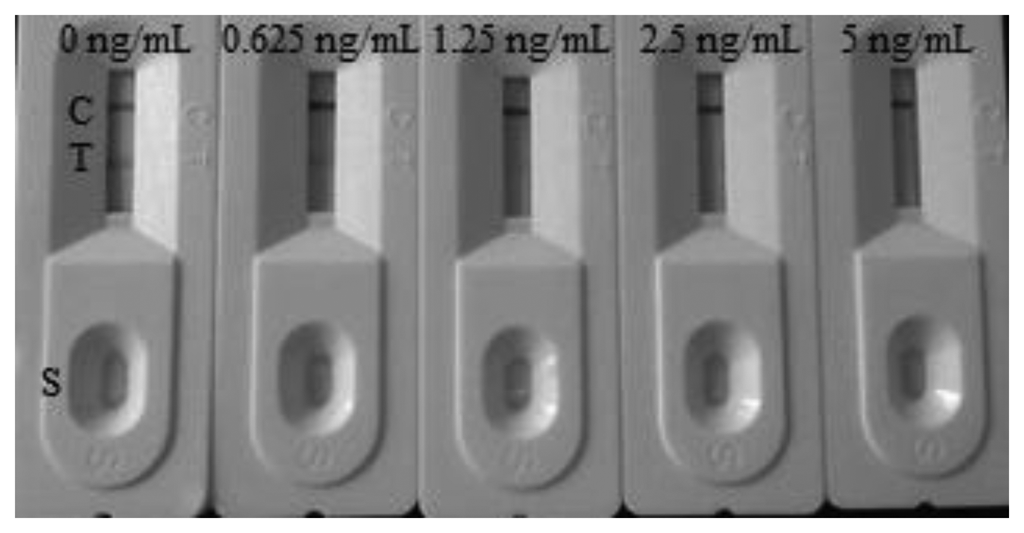 The samples were spiked with the CIP standard solution (10 μg/mL, prepared with 0.01 M PBS, pH 7.4). The final milk samples were spiked with CIP at 0, 0.625, 1.25, 2.5, and 5 ng/mL (n = 6). The spiked series were prepared and analyzed with the optimal test strips. The color intensity decreased with increasing CIP concentration. The results are summarized in Figure 7. The signal color on the test lines changed from strong to weak and disappeared completely at 2.5 ng/mL. The MRL has been set by the European Commission at 100 ng/mL for the enrofloxacin and ciprofloxacin in milk. The results of this study demonstrate the lowest detection limit of the immunochromatography assay is >2.5 ng/mL, and drug concentrations lower than this limit cannot be recognized.