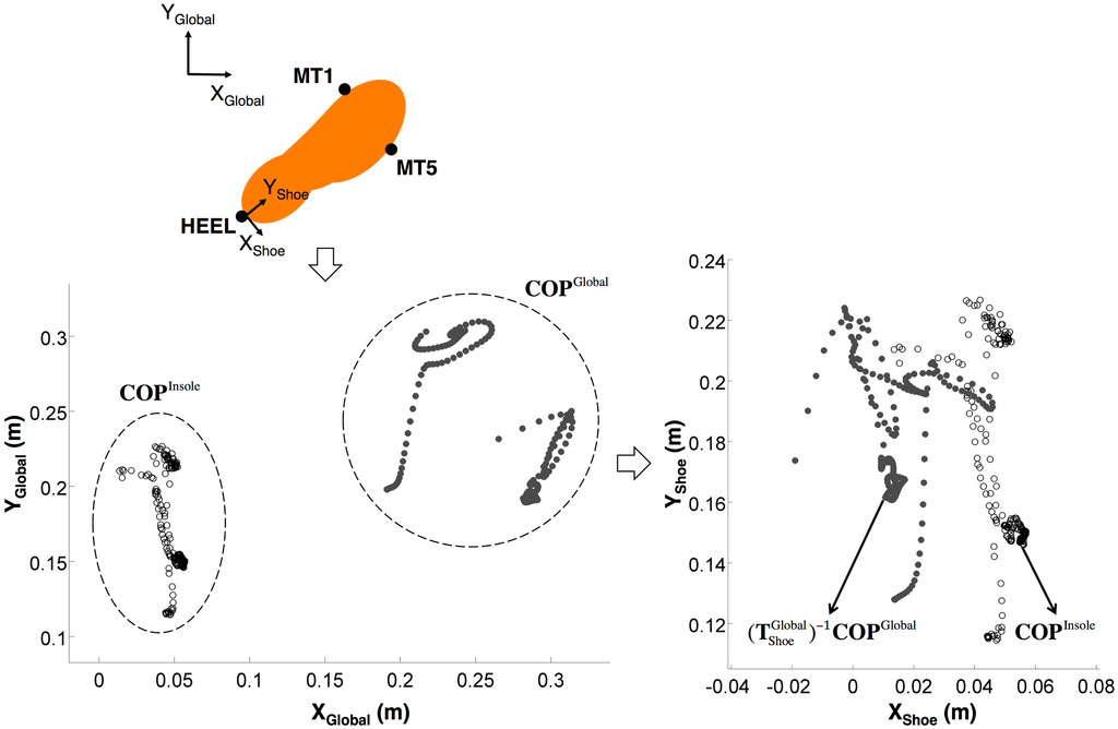 COP locations from the IPM system (i.e., expressed in the insole coordinate system) can be transformed to the global (i.e., motion capture) coordinate system [15] using: