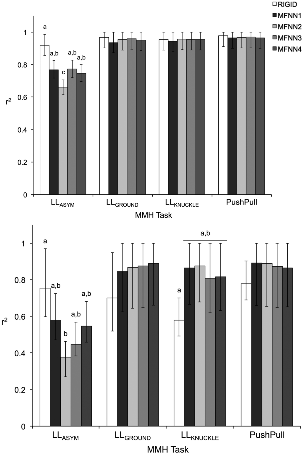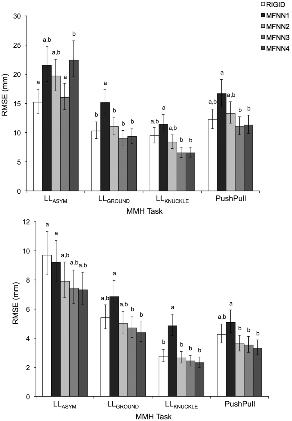 A summary of ANOVA results for all comparative measures is presented in Table 1. Only the main and interactive effects of Task and Method were significant. As shown in Figures 1, 2 and 3, comparative measures indicated relatively poorer performance during asymmetrical lifting/lowering vs. the other MMH tasks. In addition, for a given task the performance of a MFNN significantly varied depending on input variable sets, and MFNN3 generally outperformed the other MFNN models. Figures 2, 3 and 4 further highlight that the RIGID method produced comparable results to MFNN3 in some cases. Interestingly, the RIGID method (vs. MFNN methods) yielded significantly higher r2 values for asymmetrical lifting/lowering.