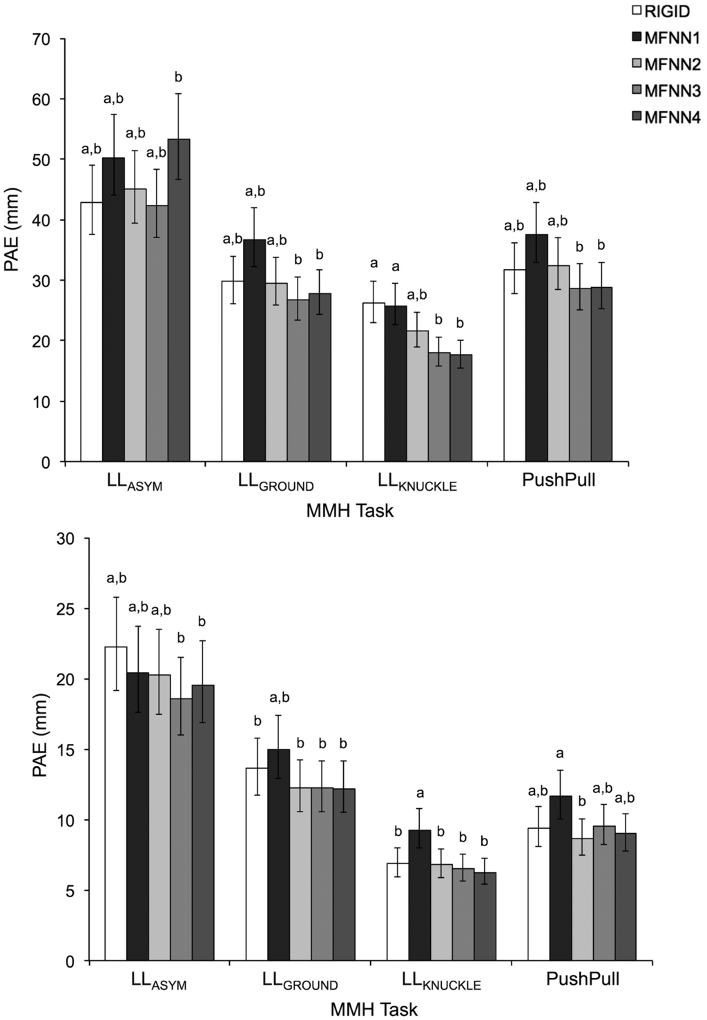 Use of a rigid body assumption to define the relationship between the insole and the shoe coordinate system may not be strictly valid, for at least two reasons. First, following the two-fold cross-validation, the rigid body transformation matrix was defined with one replication of LLGROUND and LLKNUCKLE, and tested with the other replication of all MMH activities. Therefore, if the rigid body assumption is strictly valid, fairly good performance of can be expected at least for LLGROUND and LLKNUCKLE, even though the insole captures only compressive forces (while the force platform captures tri-axial forces) and the foot may move inside the shoe during the MMH activities. LLGROUND and LLKNUCKLE, however, yielded RMSE and PAE values similar to PushPull (Figures 2,3), and smaller values of r2 in the ML direction than PushPull (Figure 4). In this study, all participants wore their own athletic shoes during data collection. An athletic shoe insole is pliant and soft, providing underfoot cushioning. Such a shoe insole could thus deform to varying degrees, depending on in-shoe foot loading patterns. This deformation may weaken the rigid body assumption for . Second, two of the nonlinear mapping functions used here (i.e., MFNN3 and MFNN4) typically performed better than or comparable to the rigid body transformation matrix (though with some exceptions such as r2 values for LLASYM). Recall that MFNN3 and MFNN4 used the ratios of active pressure sensors in the eight regions as part of the input variables, and information on such ratios likely reflected in-shoe foot loading patterns. It can thus be argued that MFNN3 and MFNN4 were trained to account, to some degree, for potential shoe insole deformation during the MMH activities.