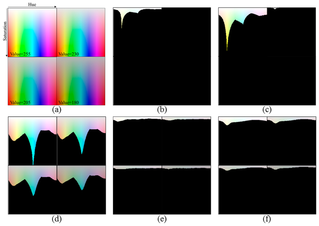 Figure 1b–d shows the detection results obtained by conventional OER detection methods. The colored region indicates the detected OER, and the black region is a well-exposed region (WER) identified by the method used. When we detect the region in which the L* values of the pixels are larger than 98 [8], a small region around the pure white and bright yellow colors is detected as an OER only in the case of V = 255, as shown in Figure 1b. In Figure 1c, pixels whose Y ≥ 230 are detected [9]. When V = 255, the detected OER includes yellow and cyan colors, which do not seem to be over-exposed. A very small OER for yellow is detected when V = 230, and the OER is not generated when V = 205 or 180. On the other hand, the over-exposed map based thresholding method intentionally detects a wide OER for OER correction, as shown in Figure 1d [10]. Thus, overly large regions are identified as OERs even though the value of V decreases. In addition, more regions for cyan and blue are considered to be over-exposed compared to the other colors, which does not coincide with the perceived OER.