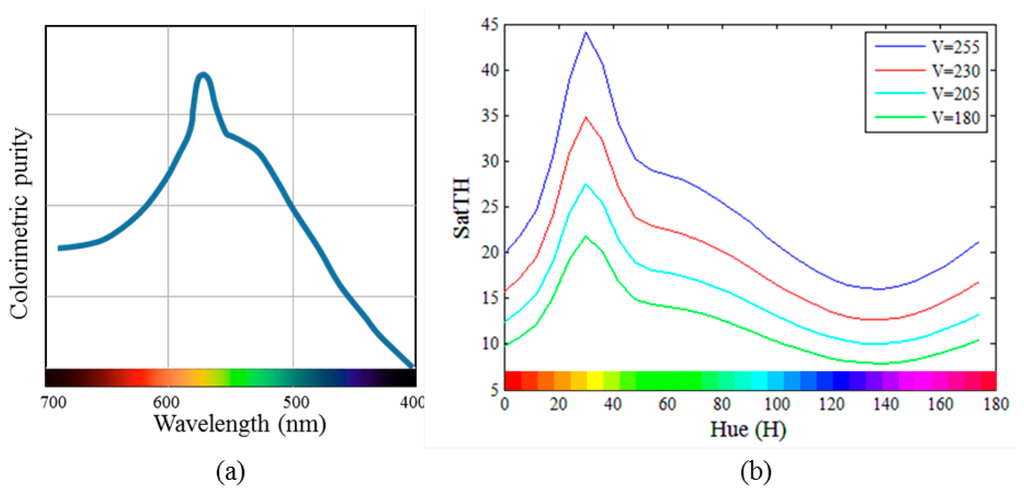 Figure 2a shows the least perceptible colorimetric purity plotted as a function of wavelength [16]. The data reported in [17–19] also show similar trends. As shown in Figure 2a, the values of Pc vary depending on the wavelength. Specifically, Pc has the maximum value near 570 nm and decreases at the ends of the spectrum. Therefore, a high luminance of the spectral light is required for yellow to be distinguished from pure white; however, for other colors such as red, blue, and violet, a mixture of white and a slight amount of spectral light can be easily distinguished from pure white. In other words, in terms of visual perception, yellow has low saturation power, whereas red, blue, and violet have relatively high saturation power. In addition, it was also reported in [18] that the wavelength sensitivity of the purity discrimination decreases as the luminance decreases.