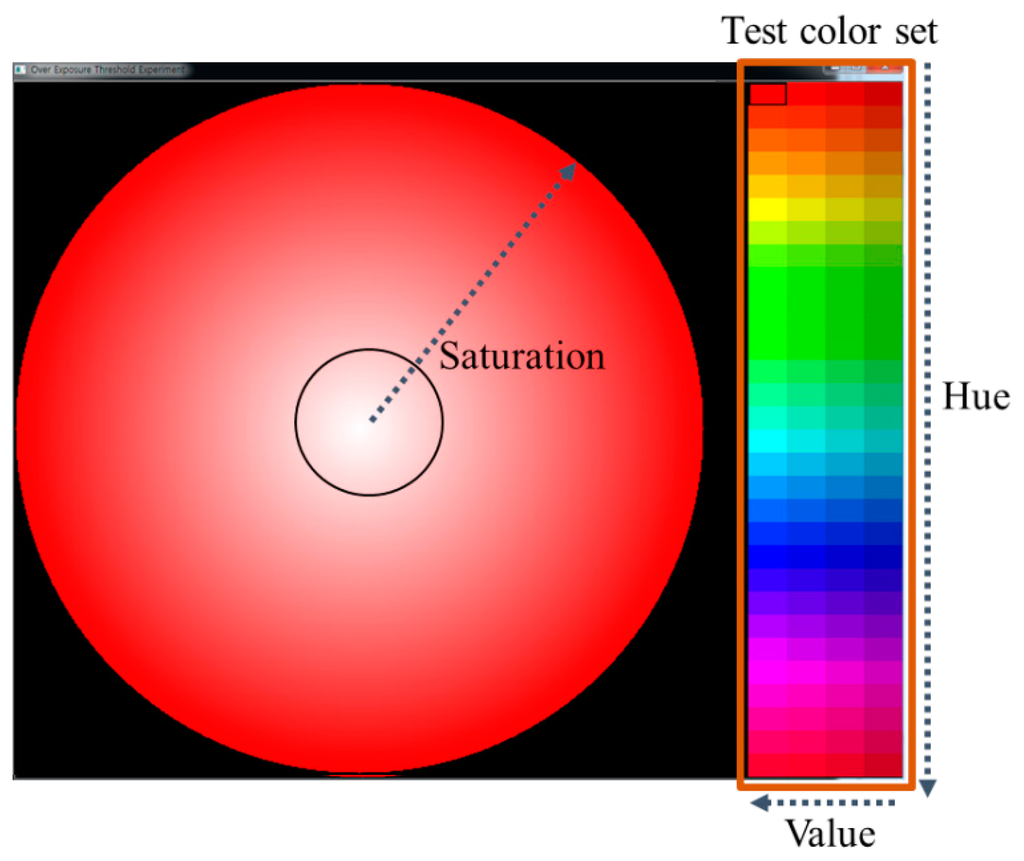 To confirm that the aforementioned saturation sensitivity of the HVS is related to the perceived OER detection, we performed an experiment using the test set shown in Figure 3. We design the test set using the HSV color space. Within the large circle in Figure 3, the value of S varies from 0 to 255 along the radius of the circle for each color in the test color set. The test color set is composed of 120 colors having four V values between 180 and 225, and sixty H values between 0° and 180°. The test set was displayed using a 27-in Samsung TA950 monitor under a measured environment illuminance of about 750 lux. The monitor has a peak brightness of 300 cd/m2 and a color temperature of 6500 K. The viewing distance was set to 80 cm from the screen. Twelve non-experts participating as subjects of the experiment were asked to make a small circle for the region appeared as pure white by adjusting the length of its radius, as shown in Figure 3. We then collected the S values for the positions on which the small circle is placed. Note that the obtained S value can be a subjective criterion for classifying the OER and WER within the large circle.