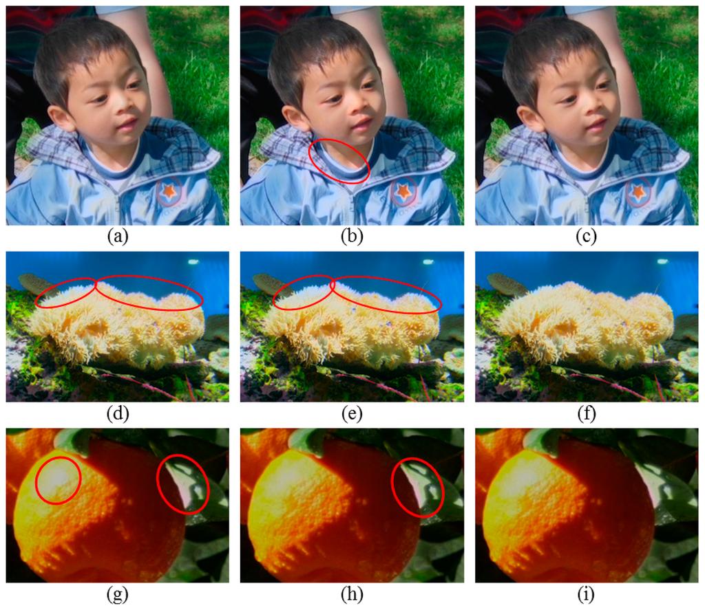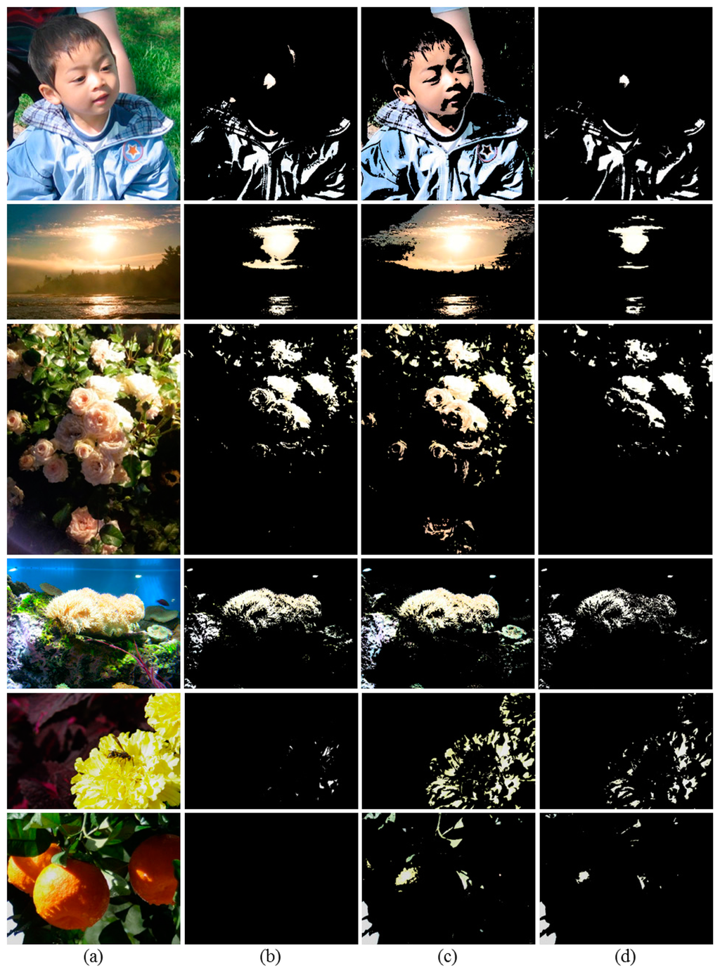 For the test images except the Flower and bee and the Oranges images, the brightness thresholding method provides better detection results compared with the over-exposed map based thresholding method as shown in Figure 5b; however, it also tends to detect a wider region than the perceived OER. On the other hand, in the Flower and bee image, it can be seen that petals of the yellow flower have a white or severely faded yellow color in certain areas, and we can therefore recognize that they are over-exposed. However, as shown in Figure 5b, the brightness thresholding method can barely detect the perceived OER because the Y values of most of these regions are actually close to 220. Likewise, the perceived OER in the Oranges image is never detected by the brightness thresholding method.
