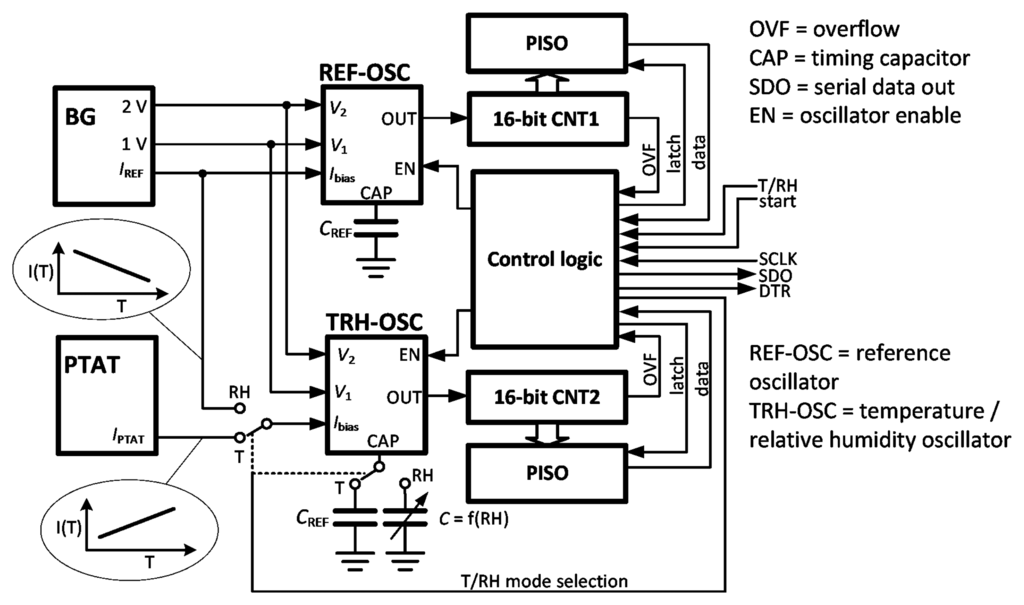 Figure 1 shows the architecture of the combined temperature and humidity sensor. The readout is based on the ratiometric frequency measurement of two relaxation oscillators. Two modes of operation are selectable by the T/RH control signal, either the temperature mode (TMOD) or the relative humidity mode (RHMOD). The operation of the reference oscillator (REF-OSC) is the same in both modes. A bandgap circuit (BG) generates temperature-independent voltage levels of 1 V and 2 V, which are used to set the thresholds of the window comparators in the oscillator. REF-OSC is always connected to the same reference capacitor (CREF) and supplied by bias current IREF, biasing its internal current source/sink. This current is generated in BG and has a negative temperature coefficient; therefore, the frequency of REF-OSC decreases with an increase in temperature.
