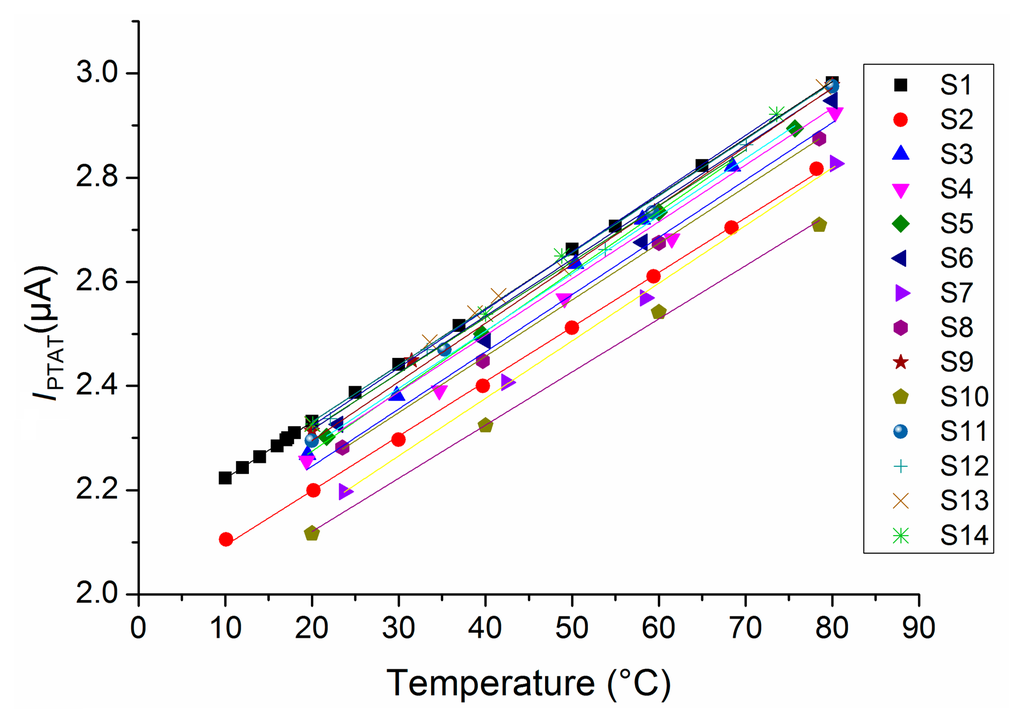 The measured results confirmed the principle that the reference current can be designed to have a negative temperature coefficient with a low spread of slopes. As the slopes are related to the complementary temperature coefficient of the n-well resistors, it follows that their spread in the temperature coefficient must be low, as well. It was demonstrated that a compromise between linearity and sensitivity can be achieved by choosing the type of resistors R1–R3 (Figure 5a) on the basis of a desired temperature coefficient. Non-silicided P+ poly resistors, for example, can have a temperature coefficient as low as 40 ppm/°C, which would greatly improve the linearity at the cost of PTAT sensitivity.
