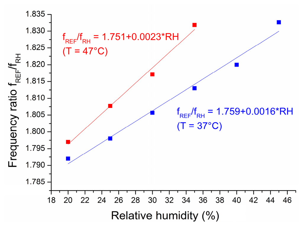 The behaviour of the measured oscillator frequency ratio between 20% RH and 45% RH for a representative chip from Version 2 is shown in Figure 11. The directly measured frequency ratio fREF/fRH is shown. The ratio follows a linear trend with humidity, where the slopes are dependent on the temperature (0.0016/% RH at 37 °C and 0.0023/% RH at 47 °C). The normalized sensitivity at 37 °C and 0% RH is 909 ppm/% RH, where both intercepts nearly meet. The temperature error at 0% RH would be 1% RH per 2 °C, which is lower than what was expected from Equation (11). The reasons behind this temperature dependency are discussed in Section 6.